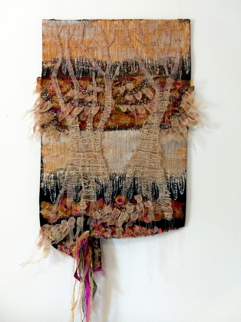 2021 78 x 110/160 x 5 cm Acrylic painting, hand embroidery on textile collage, beading, hand weaving on metal wire, felt base, wooden reinforcement structure